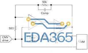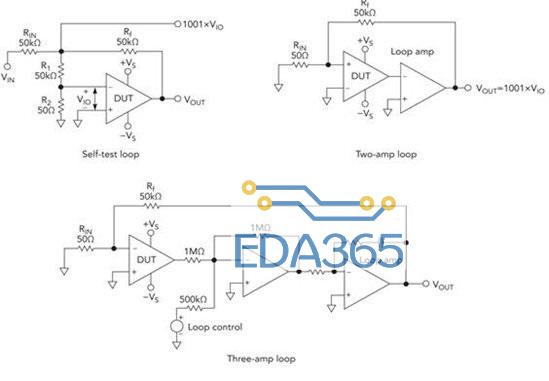 双放大器环路测试法的一种变化形式为三放大器环路,其可通过电流引导实现对被测试器件输出电压的控制。该环路的补偿可通过第二个环路放大器的 rc 组合进行设置。与在双运算放大器电路中一样,被测试器件的电压失调也是在
